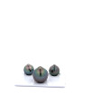 This 12.62/9.50/9.35mm , fine grade, Natural colour and luster, Bead cultured Tahitian Black Pearl Trio was harvested in French Polynesia . It features Good lustre , Lightly blemished surface , and Good nacre . Tahitian pearls are harvested from Pinctada margaritiferal oysters grown in semi-enclosed lagoons. Responsible oyster collecting and hatchery technology contribute to make the sector non-extractive. Waste and resource management are crucial to ensure quality pearls can continue to be harvested in those ecosystems and provide livelihood opportunities to communities living in often isolated areas. The sector follows strict protocols described in French Polynesia department of Fisheries code of practice, making our supplier ethical.